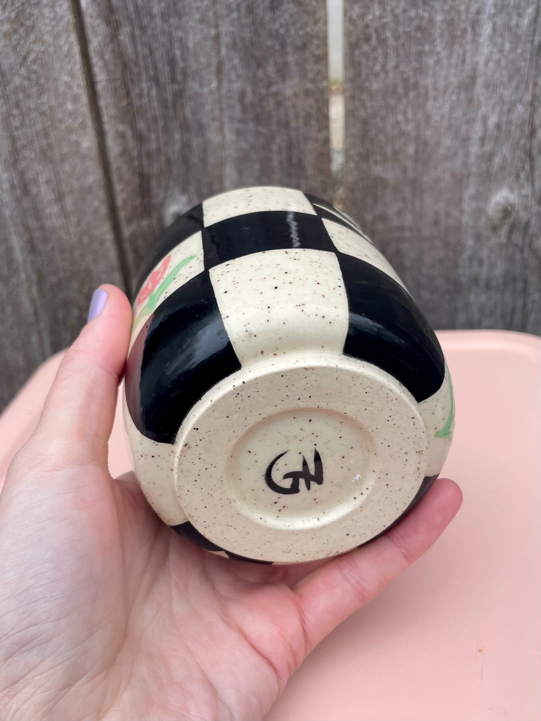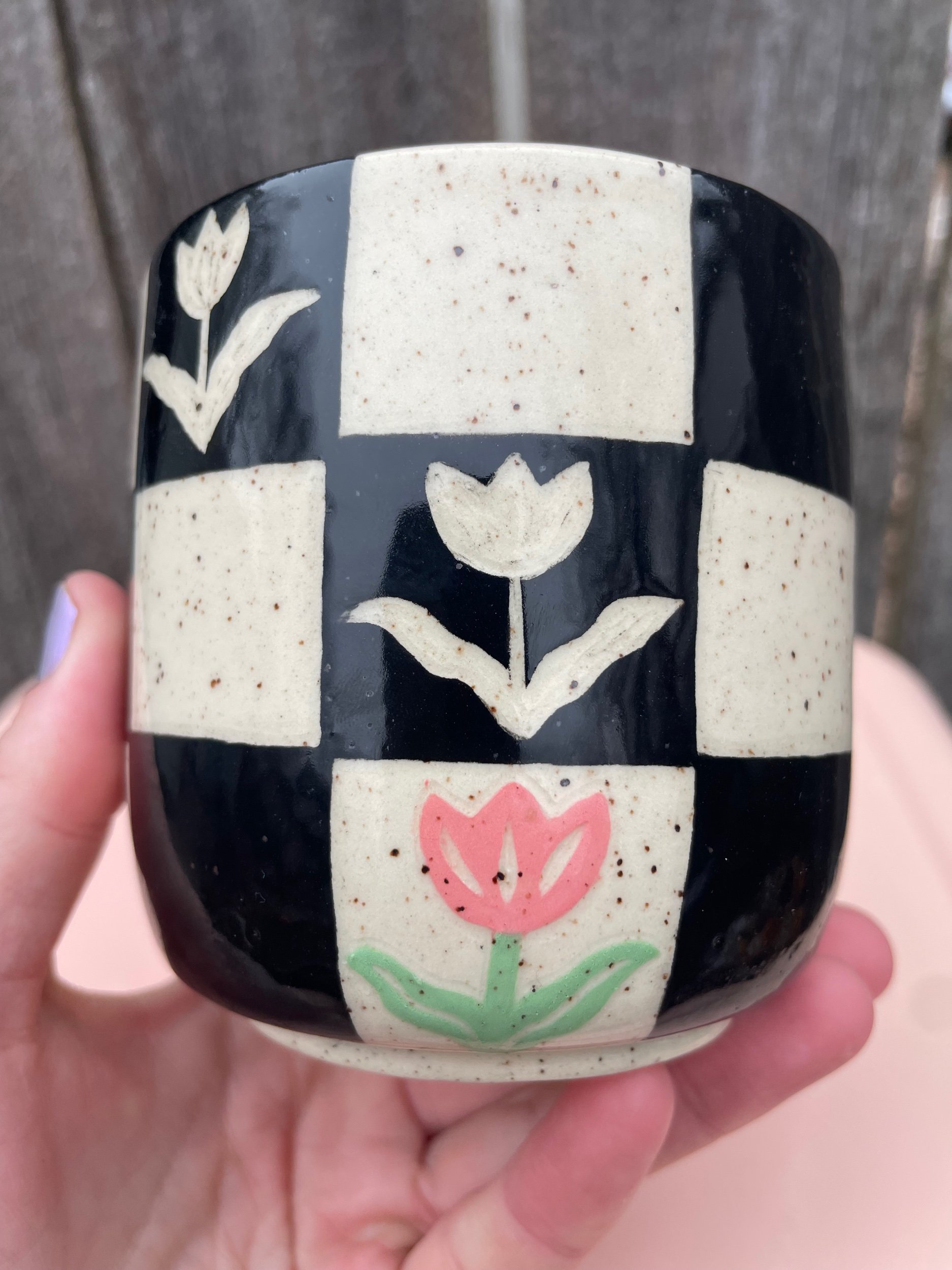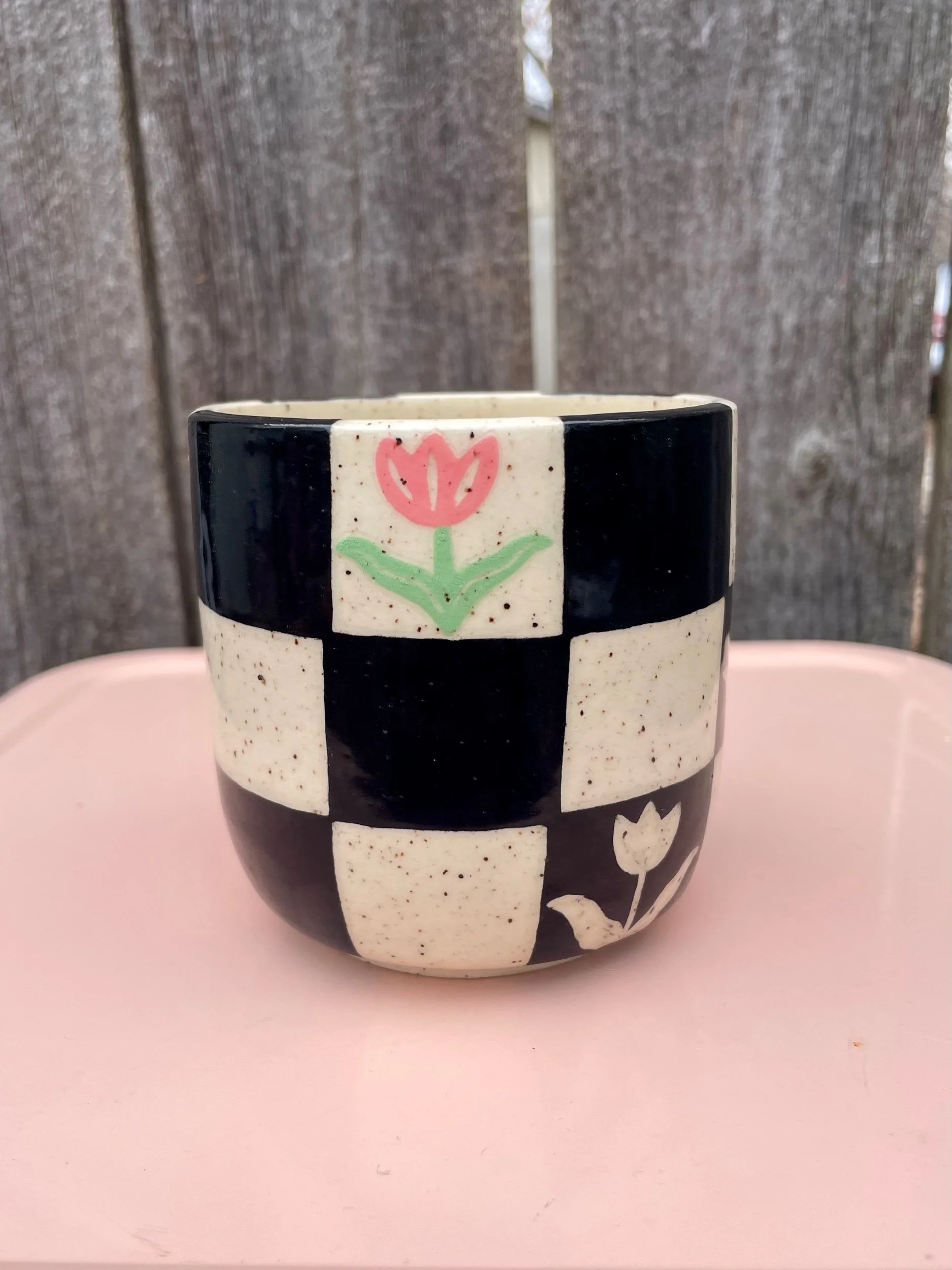 Hand thrown ceramic tumbler cup. Has a underglaze design and a clear glaze on top that makes it liquid safe as well as microwave and dishwasher safe. 3.5 in tall x 3.5 in wide.