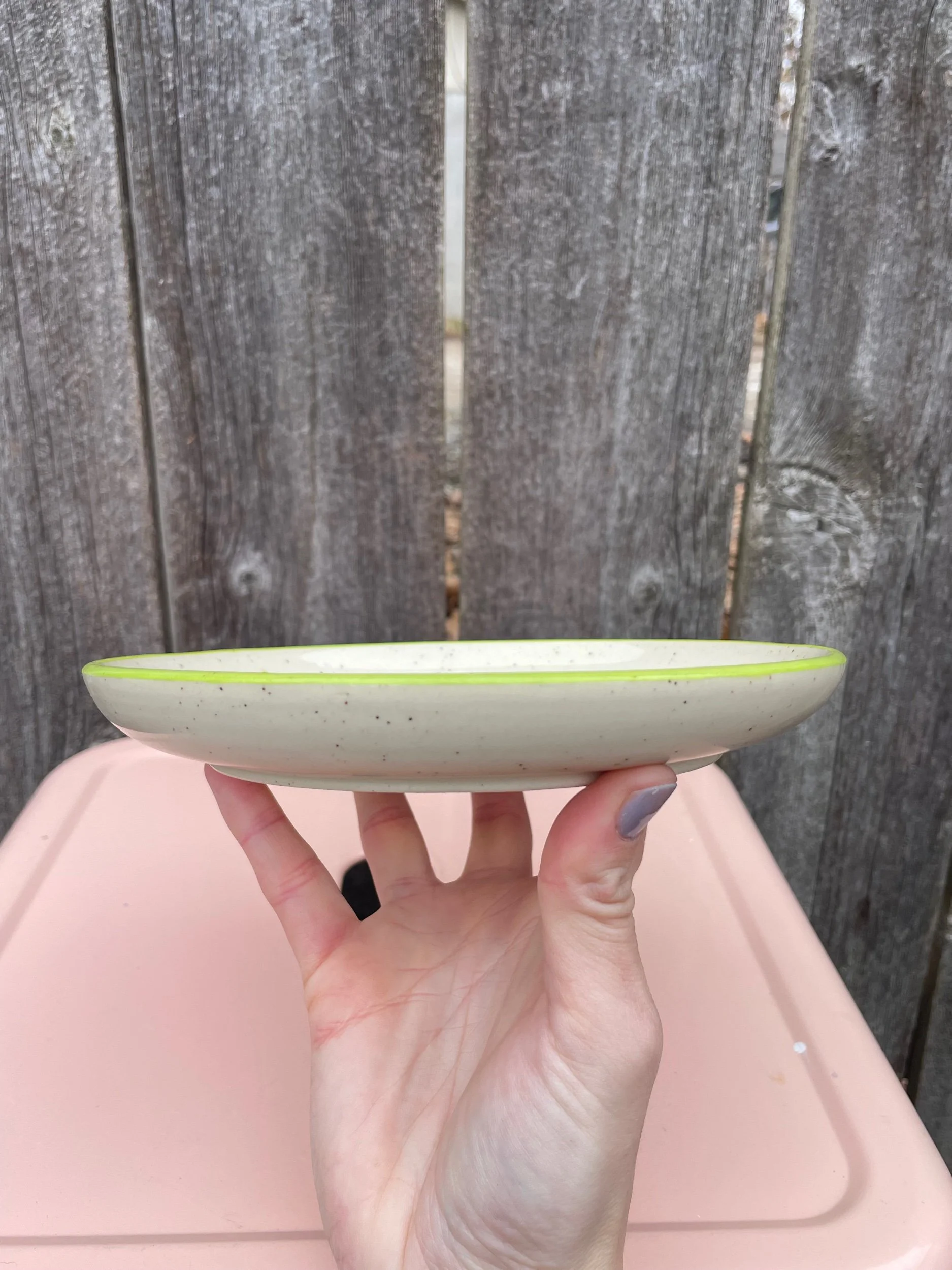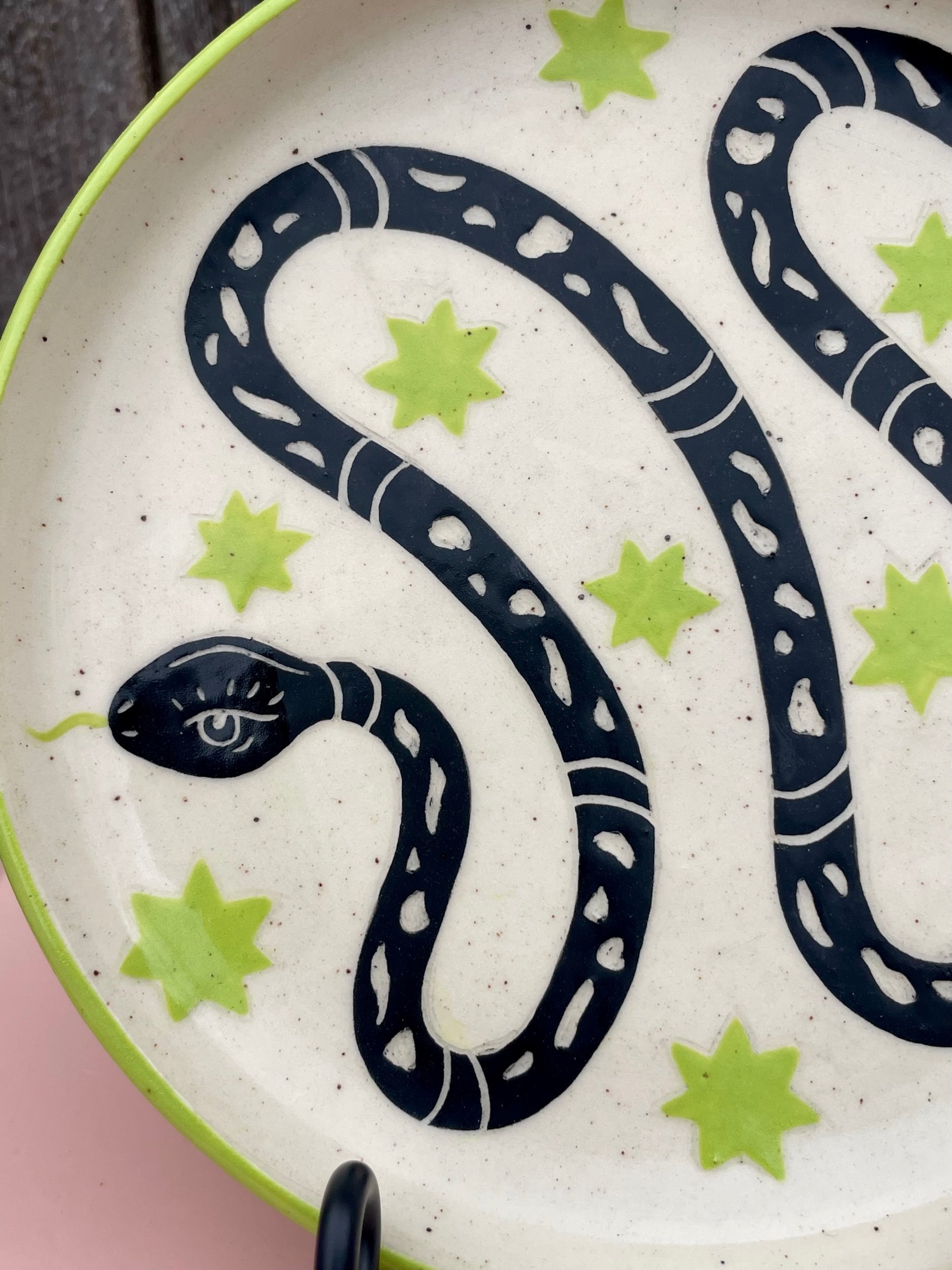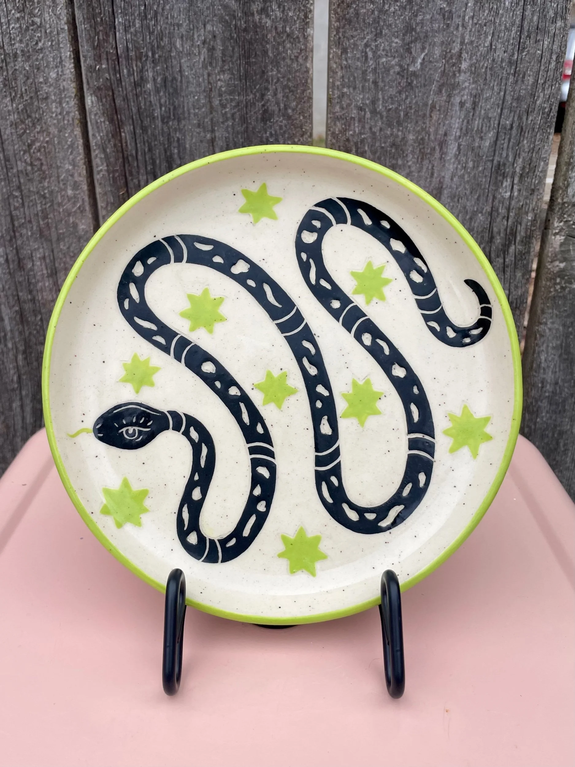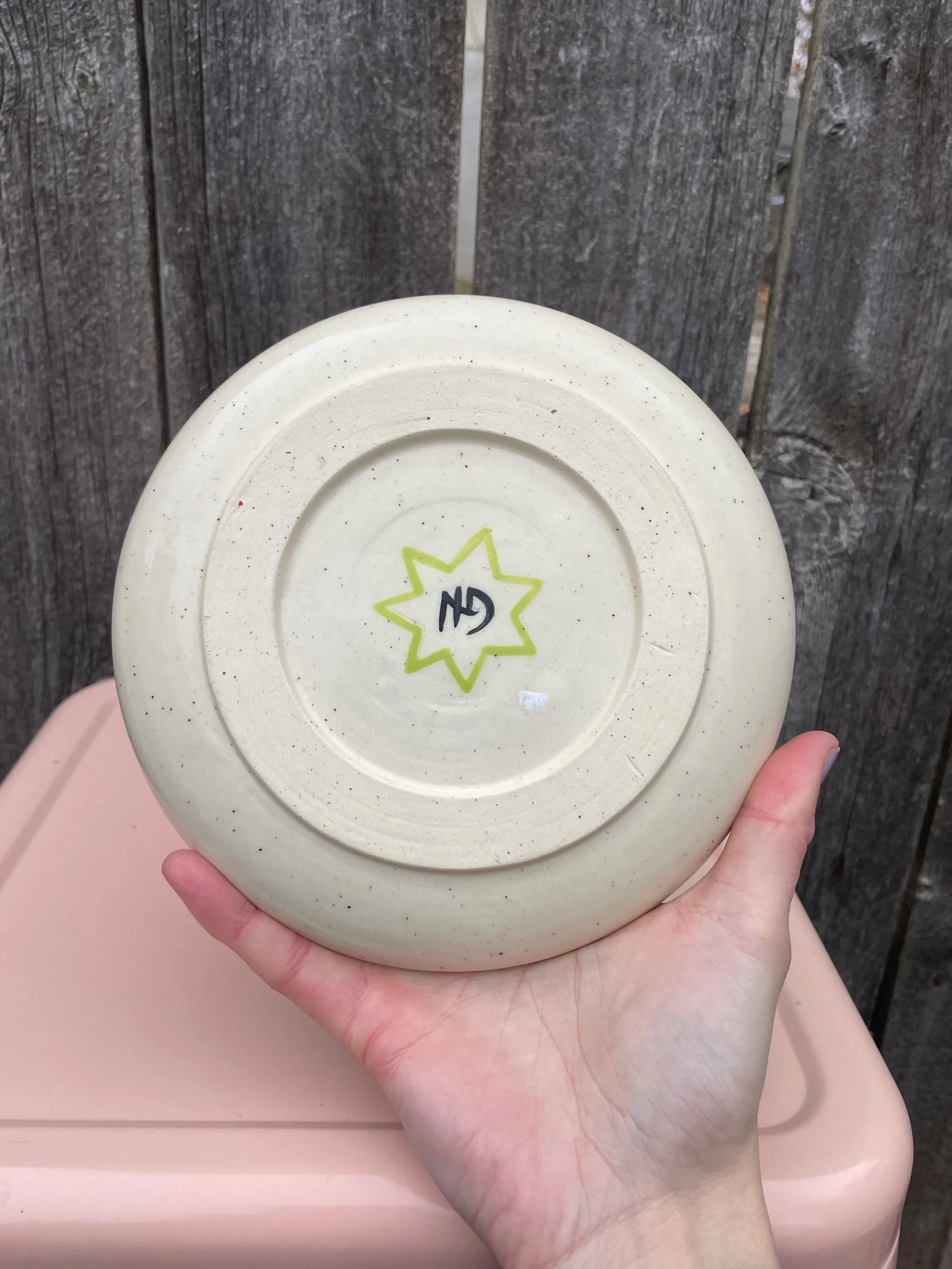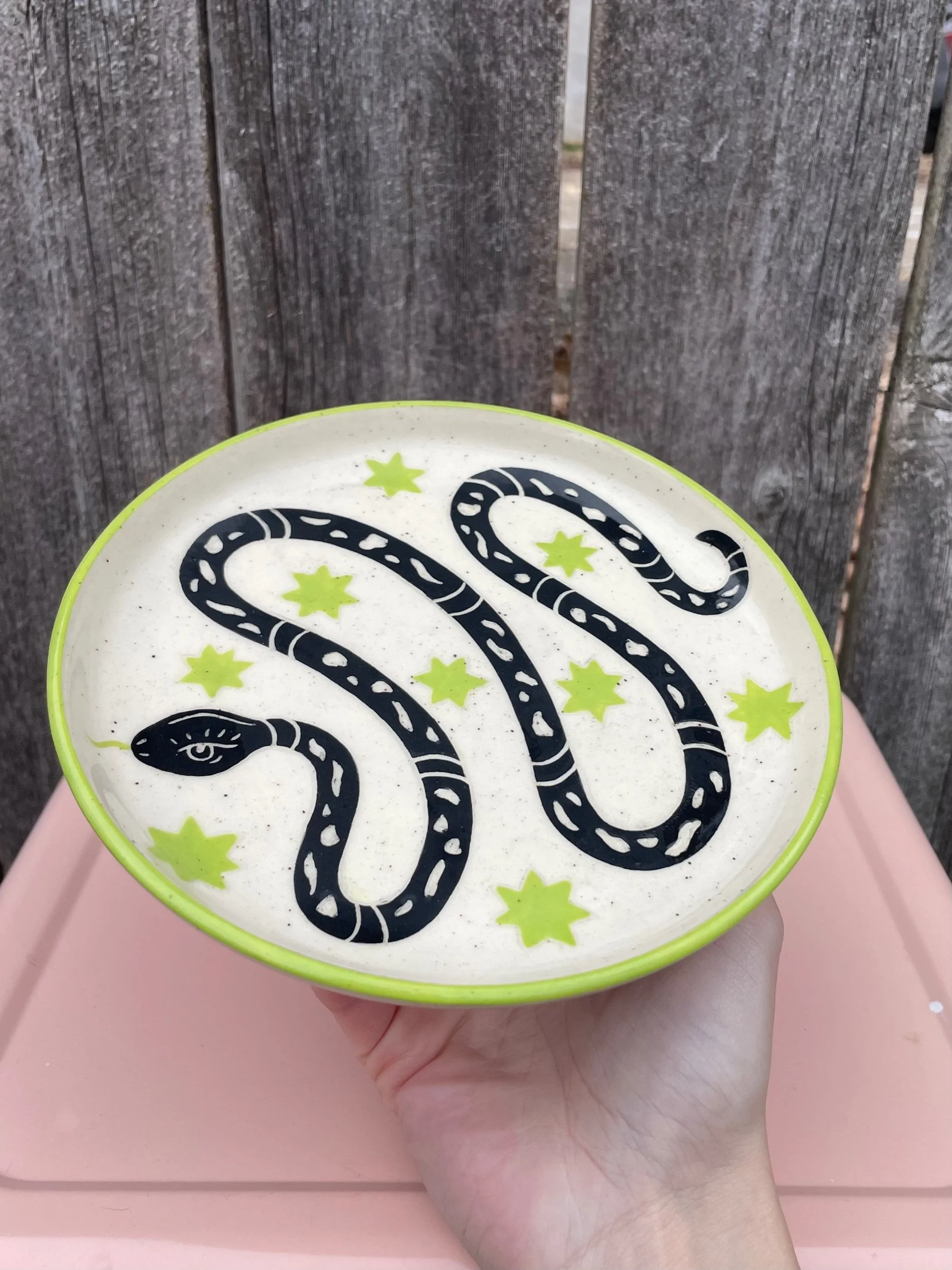 Handmade ceramic plate with an underglaze design and clear glaze on top. Food, microwave and dish washer safe, but hand washing is always safest. 7in wide.