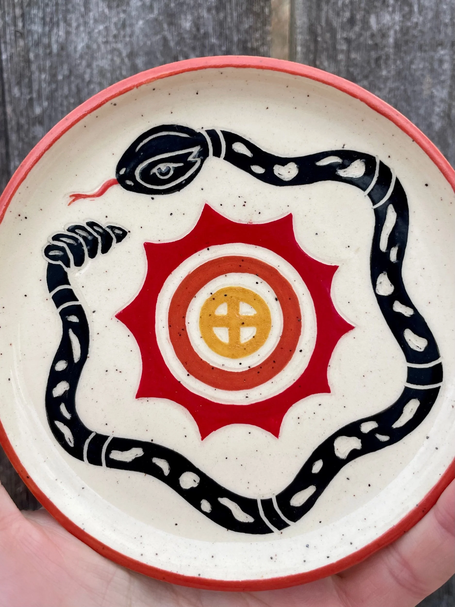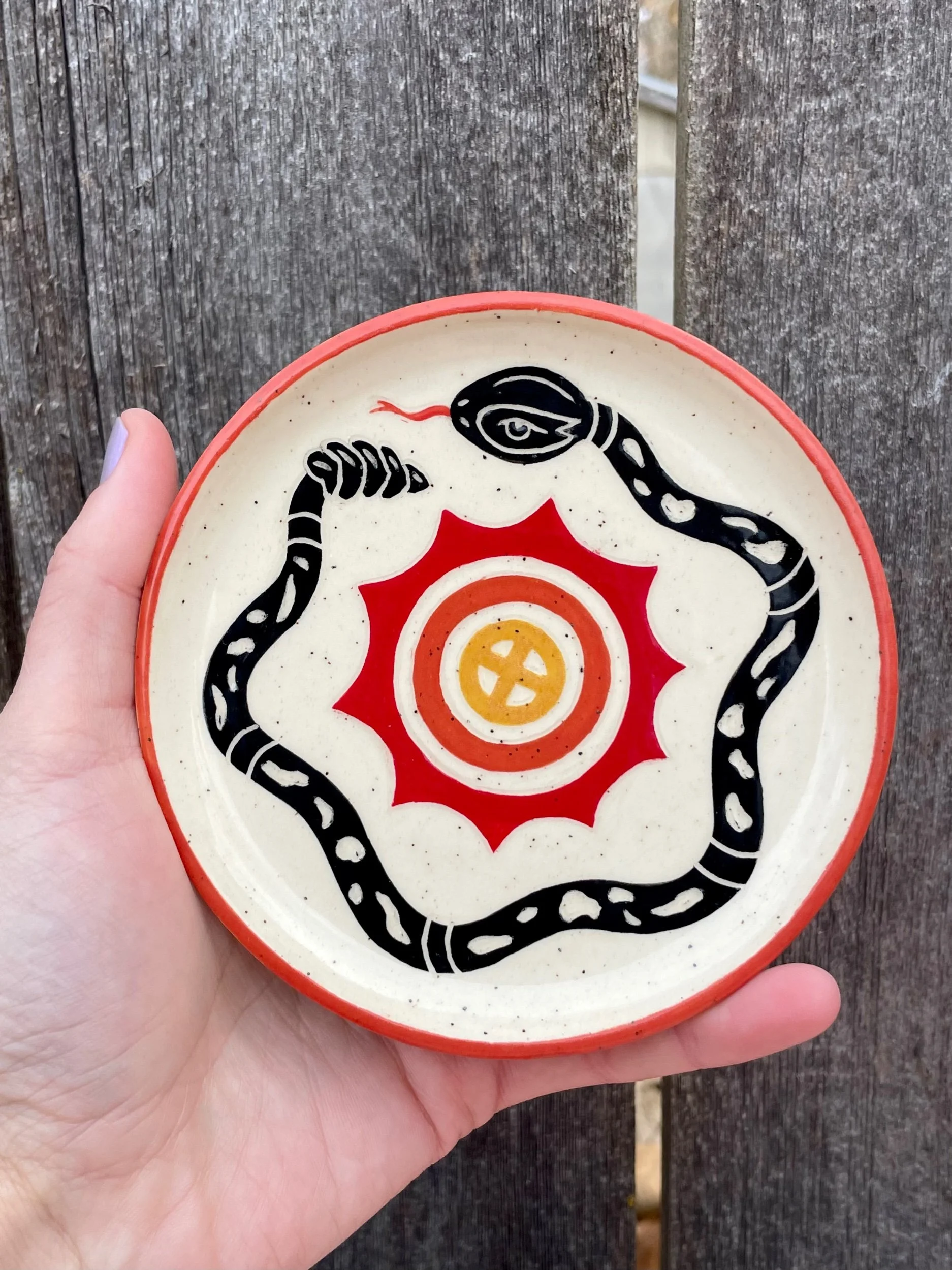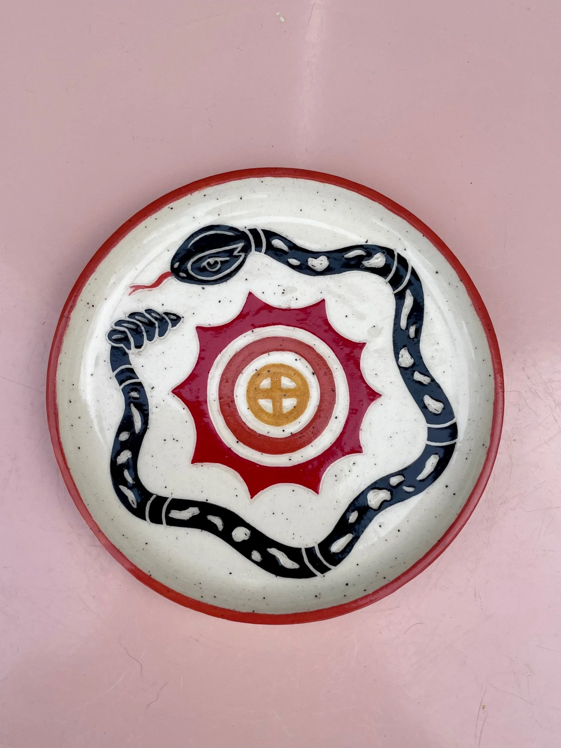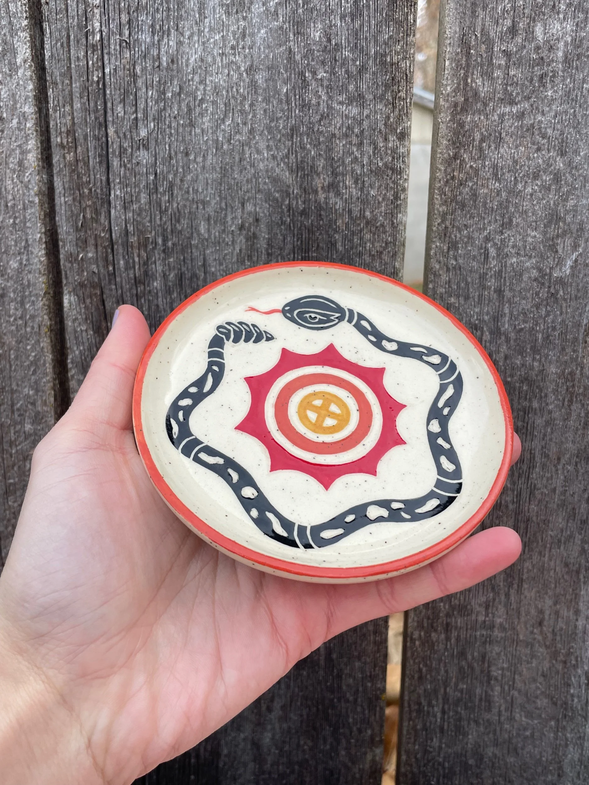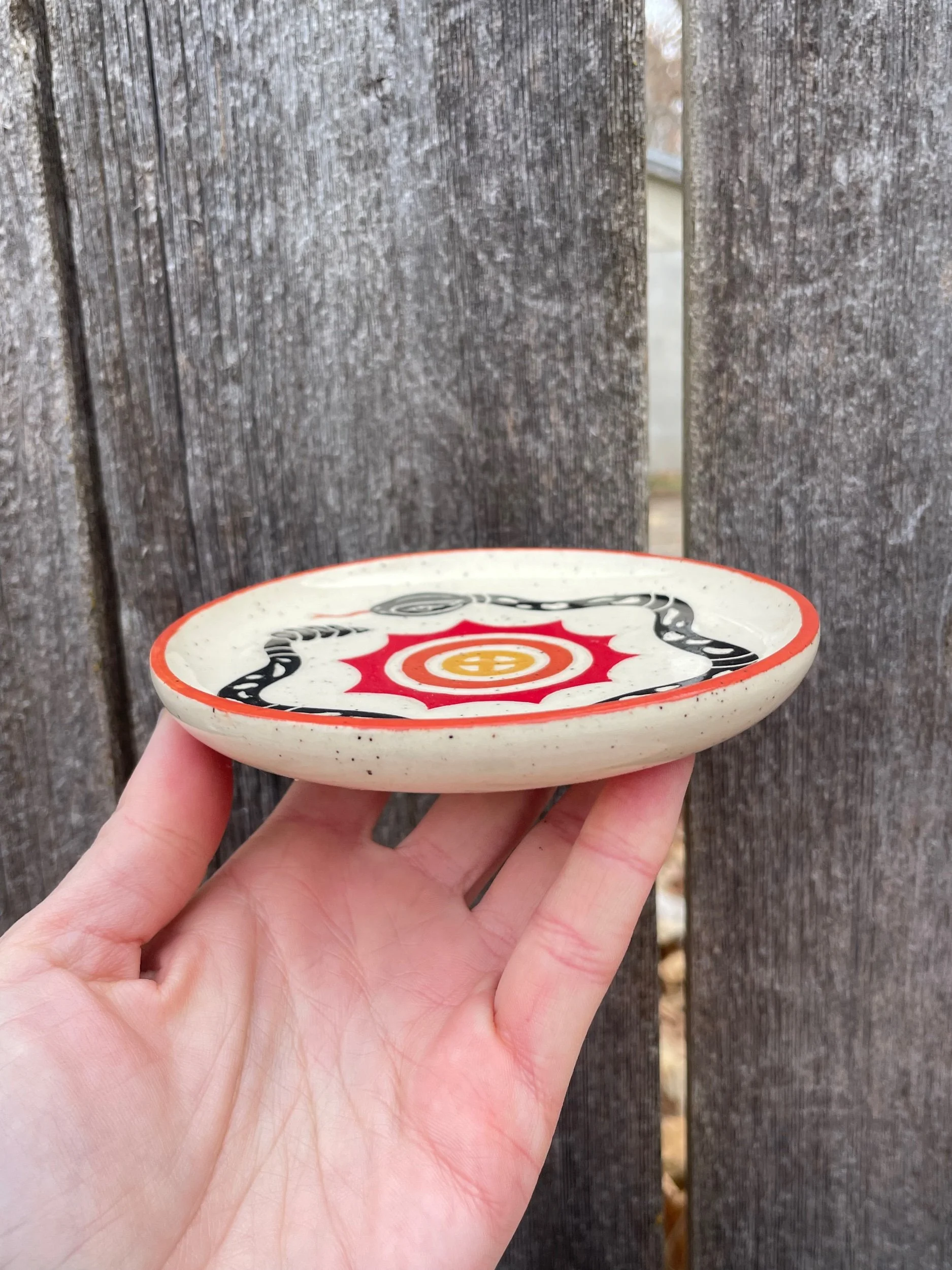 Handmade ceramic dish with an underglaze design and clear glaze on top. Food, microwave and dishwasher safe, but hand washing is always safest. 4.5 in wide, .5 in tall.