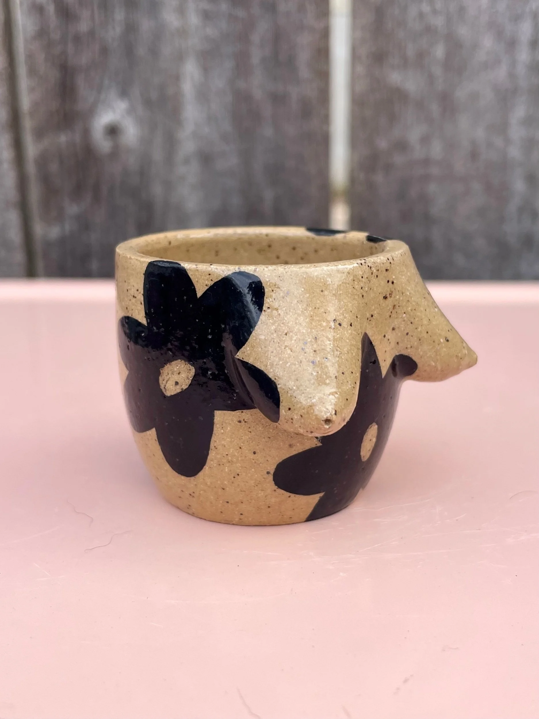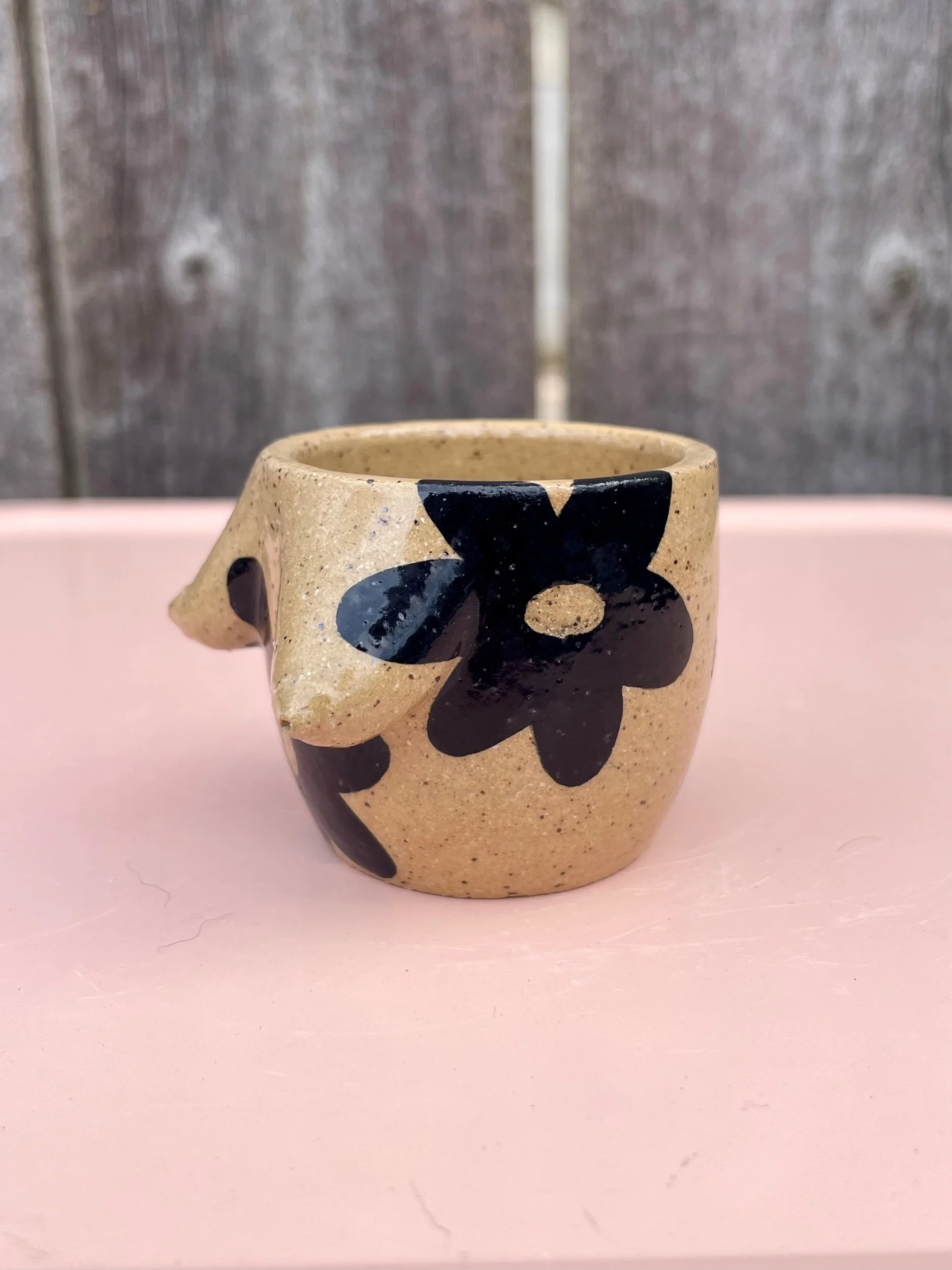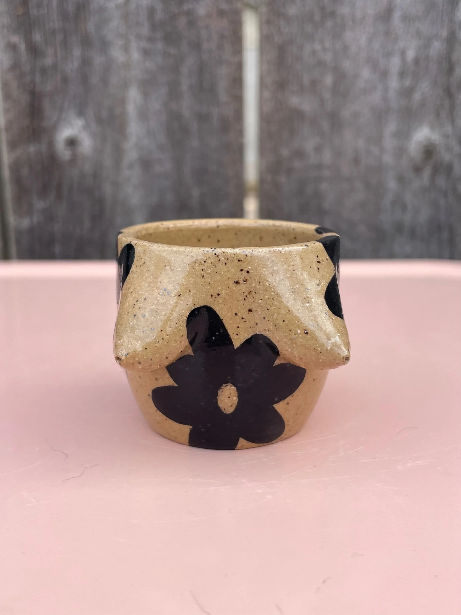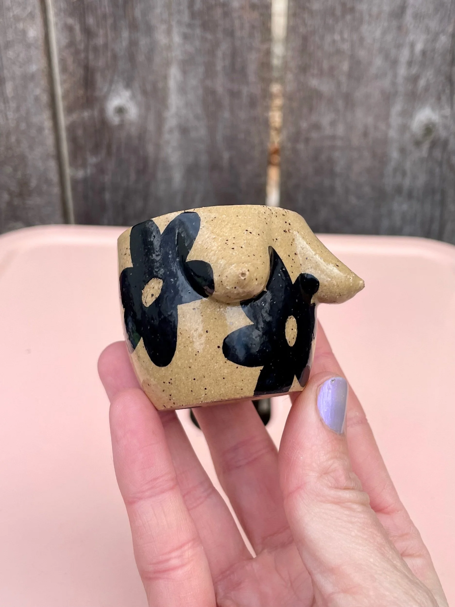 Handmade ceramic cup with sculpted boobies, an underglaze design and a clear glaze on top. Liquid, microwave and dishwasher safe, but hand washing is always safest. Perfect for a shot glass or espresso! 1.7 in tall and 1.7 in wide