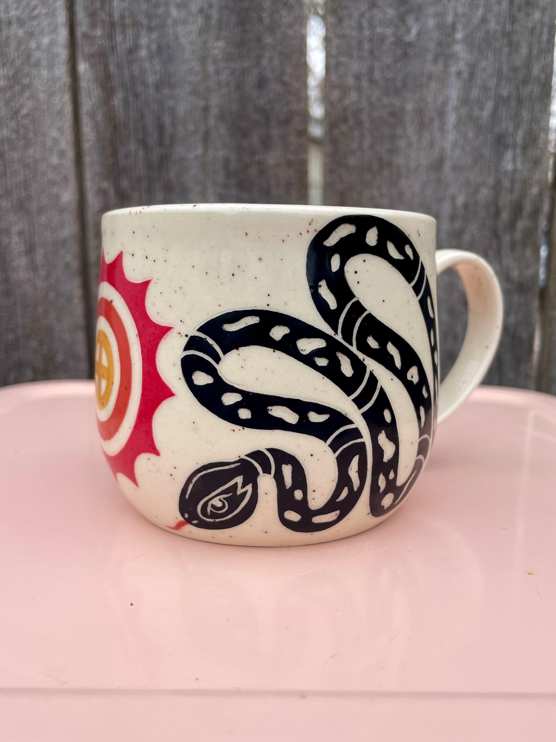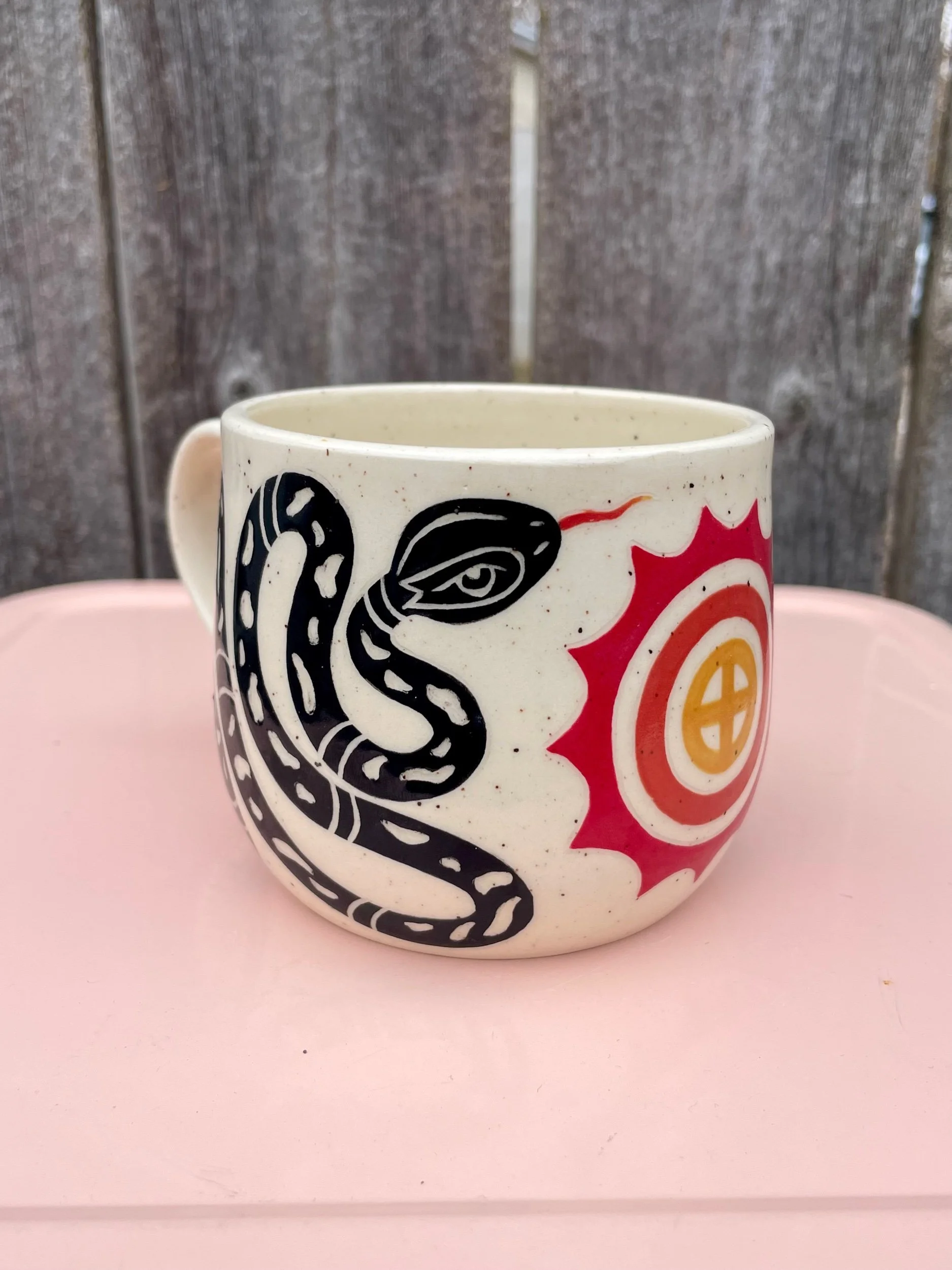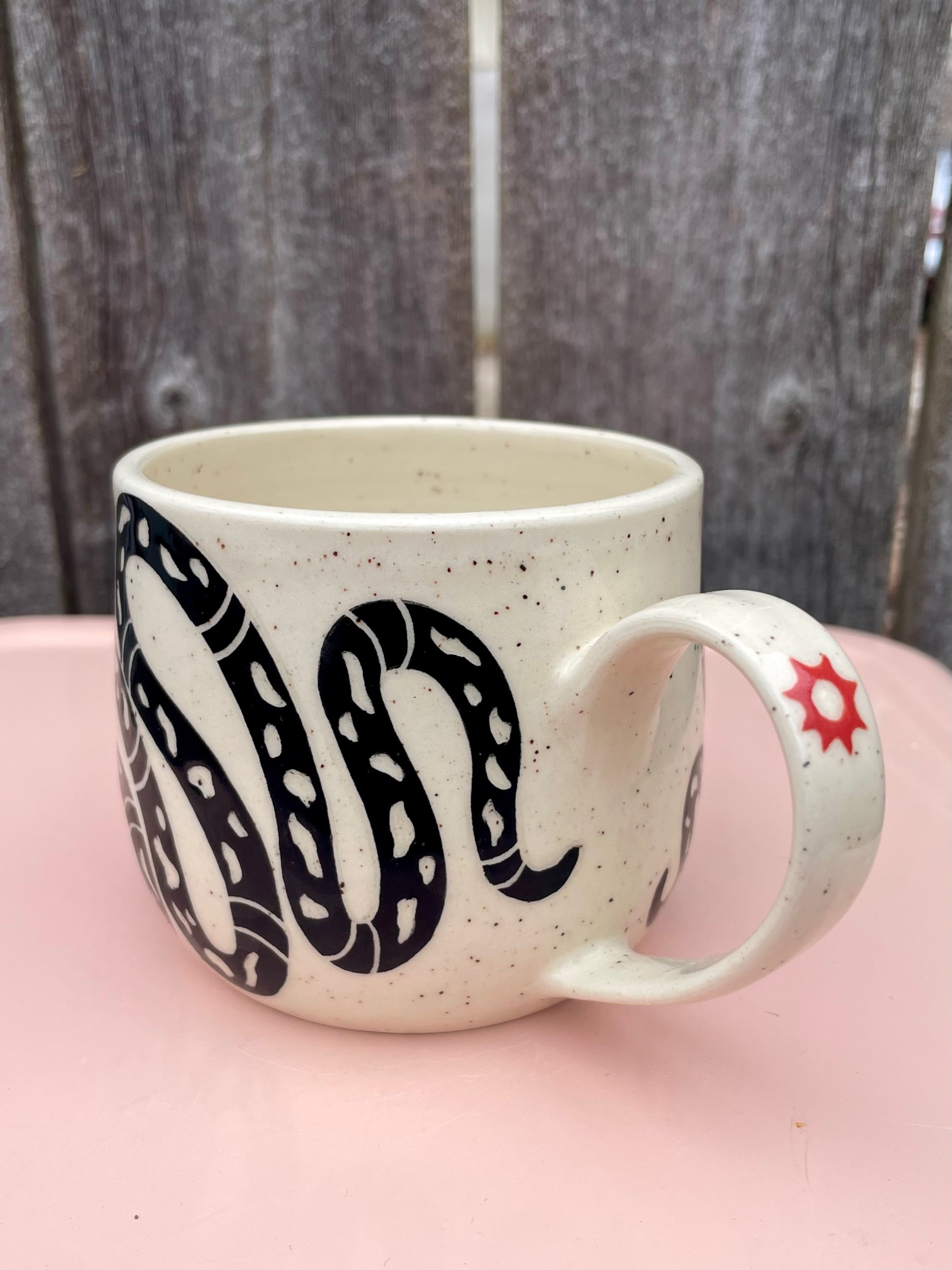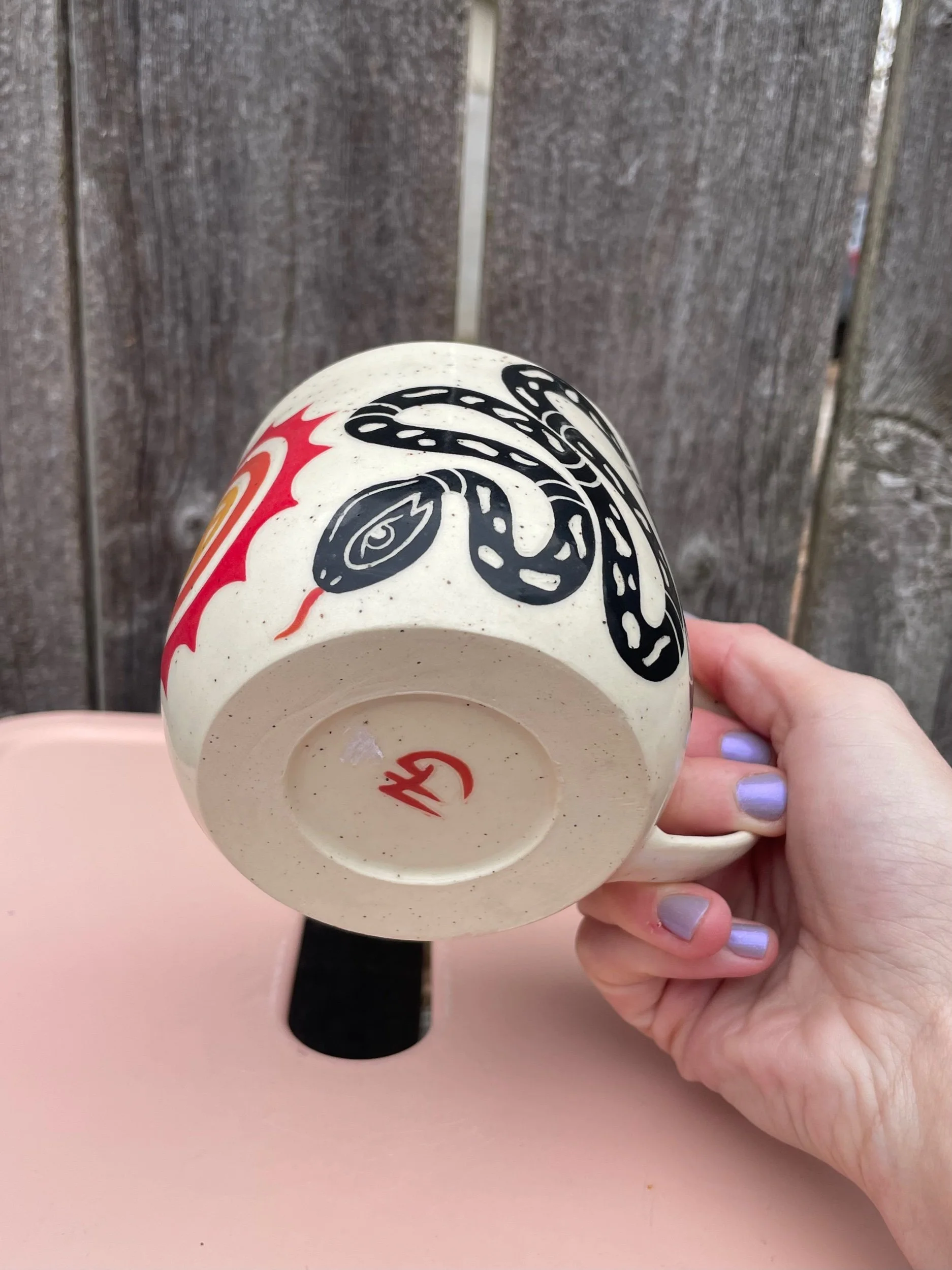 Hand made ceramic mug with underglaze design. Has a clear glaze that makes it liquid safe as well as dishwasher and microwave safe. Hand washing is always safest though! 3.2 in tall and 3.4 inch wide mouth.
