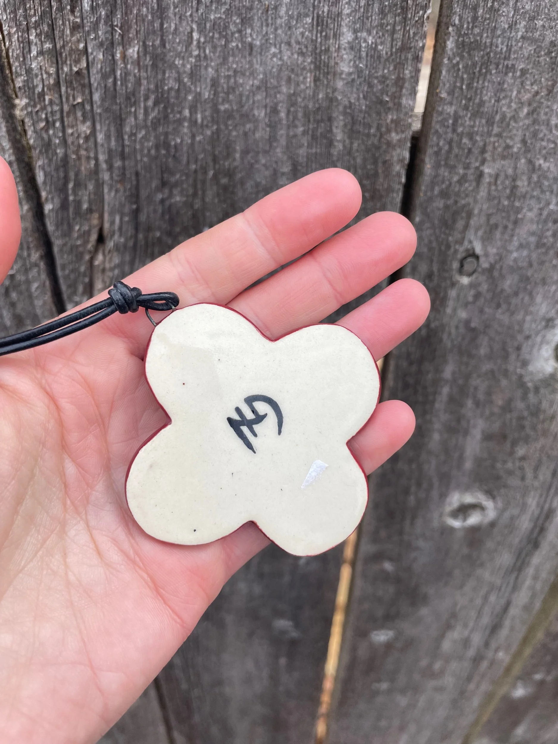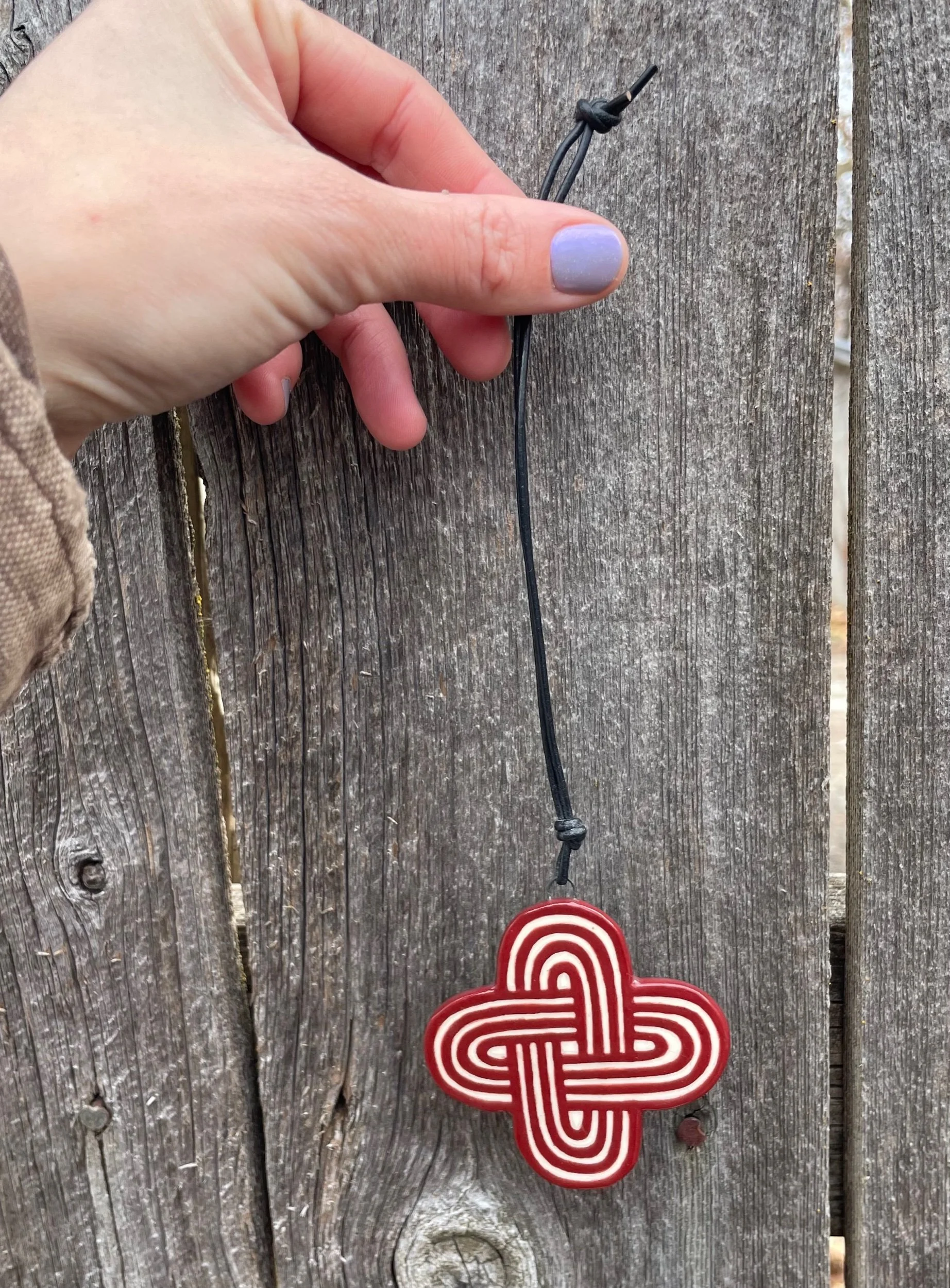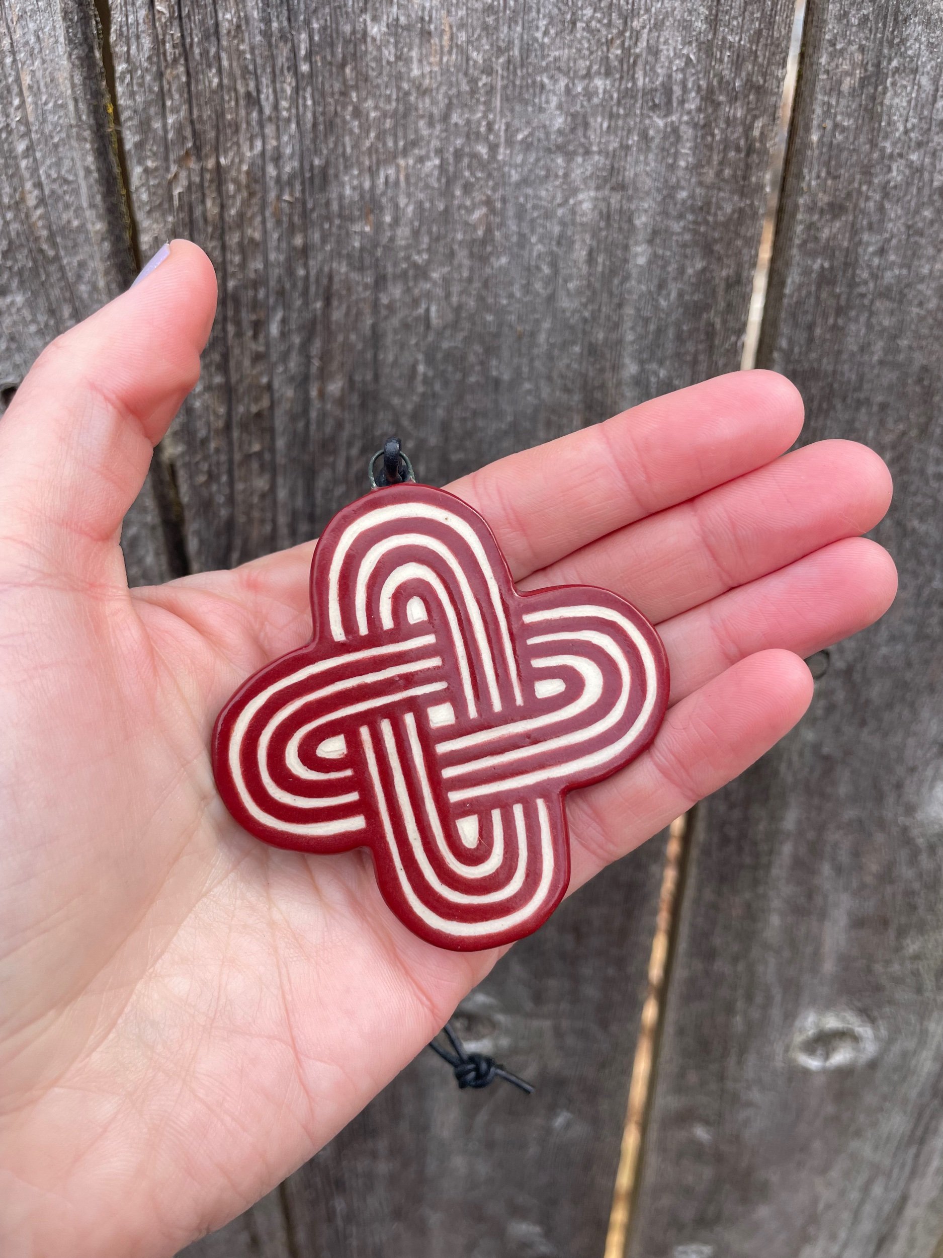 Handmade ceramic ornament with the southeastern knot design. Has a clear glaze on top. Could also be worn as a necklace or wall hanging and cord on it could be changed. 2.5 in wide.