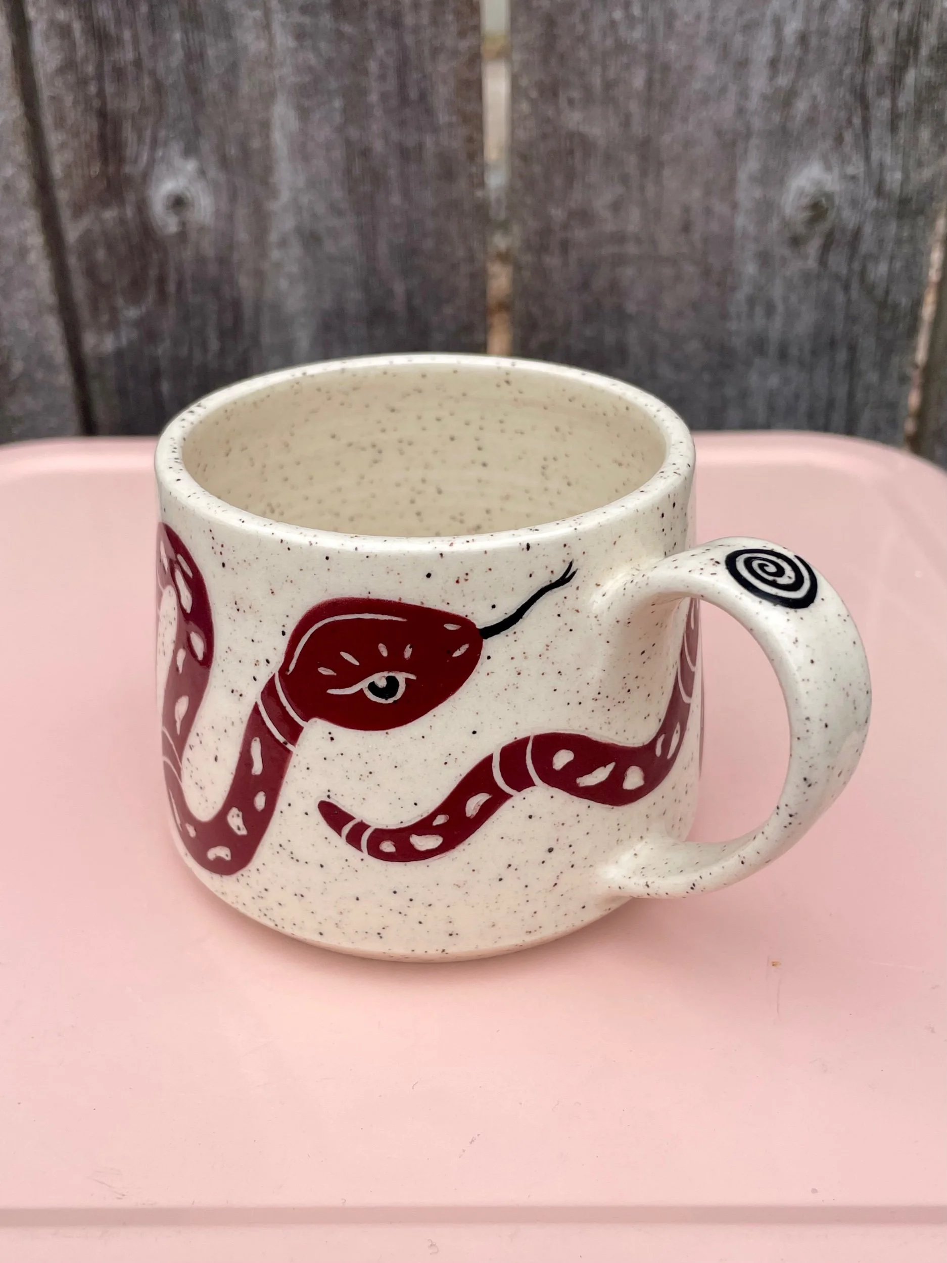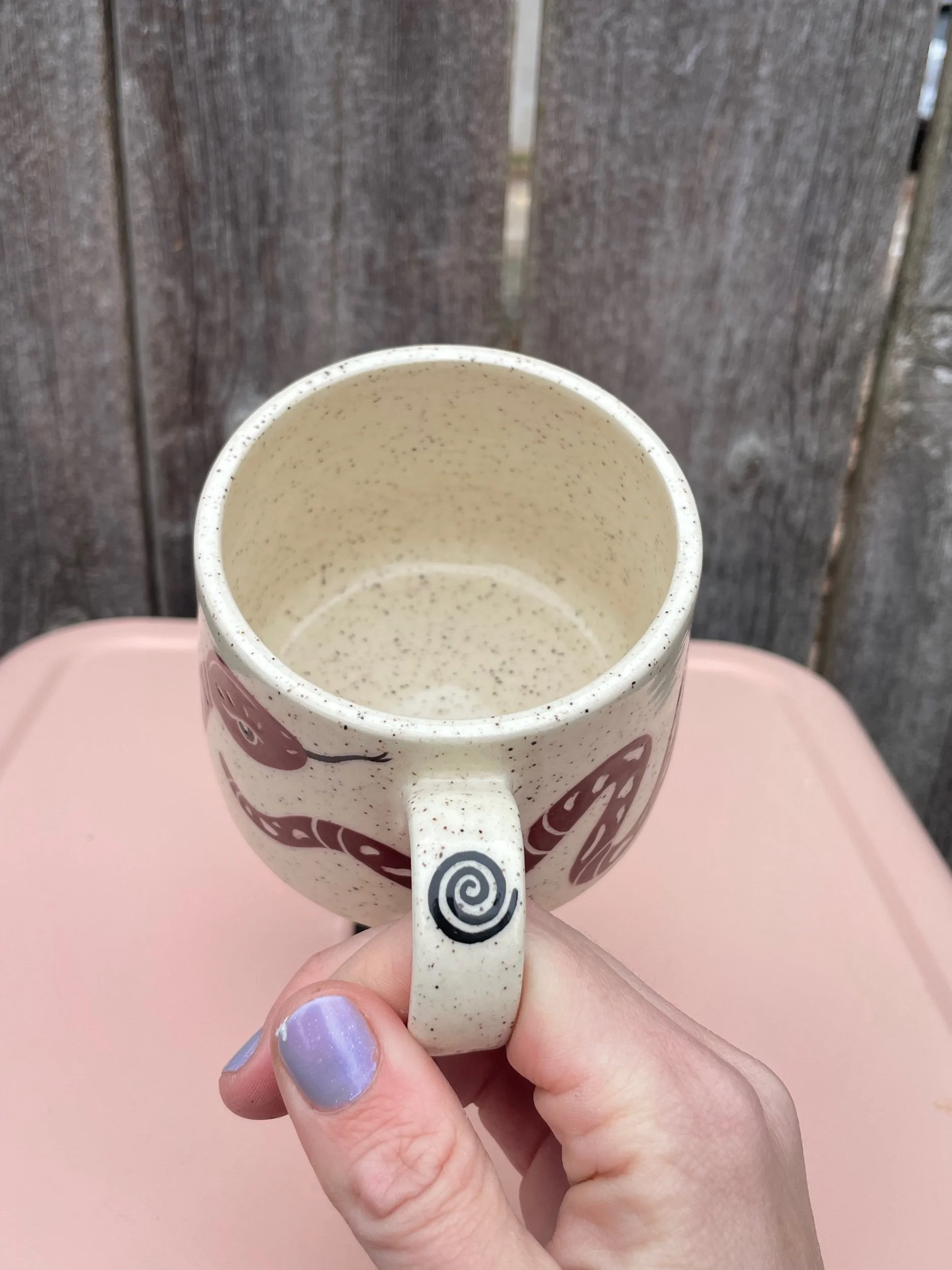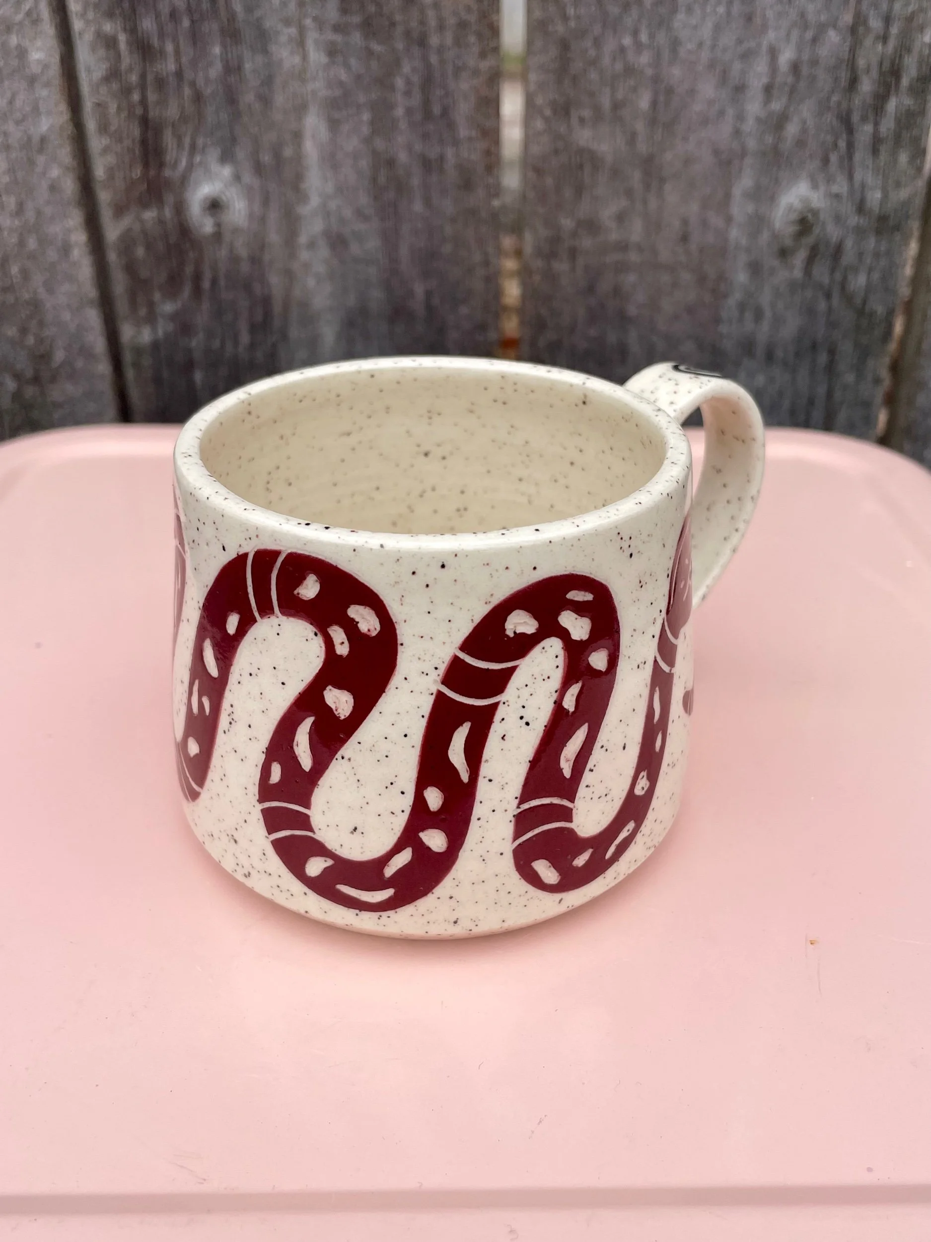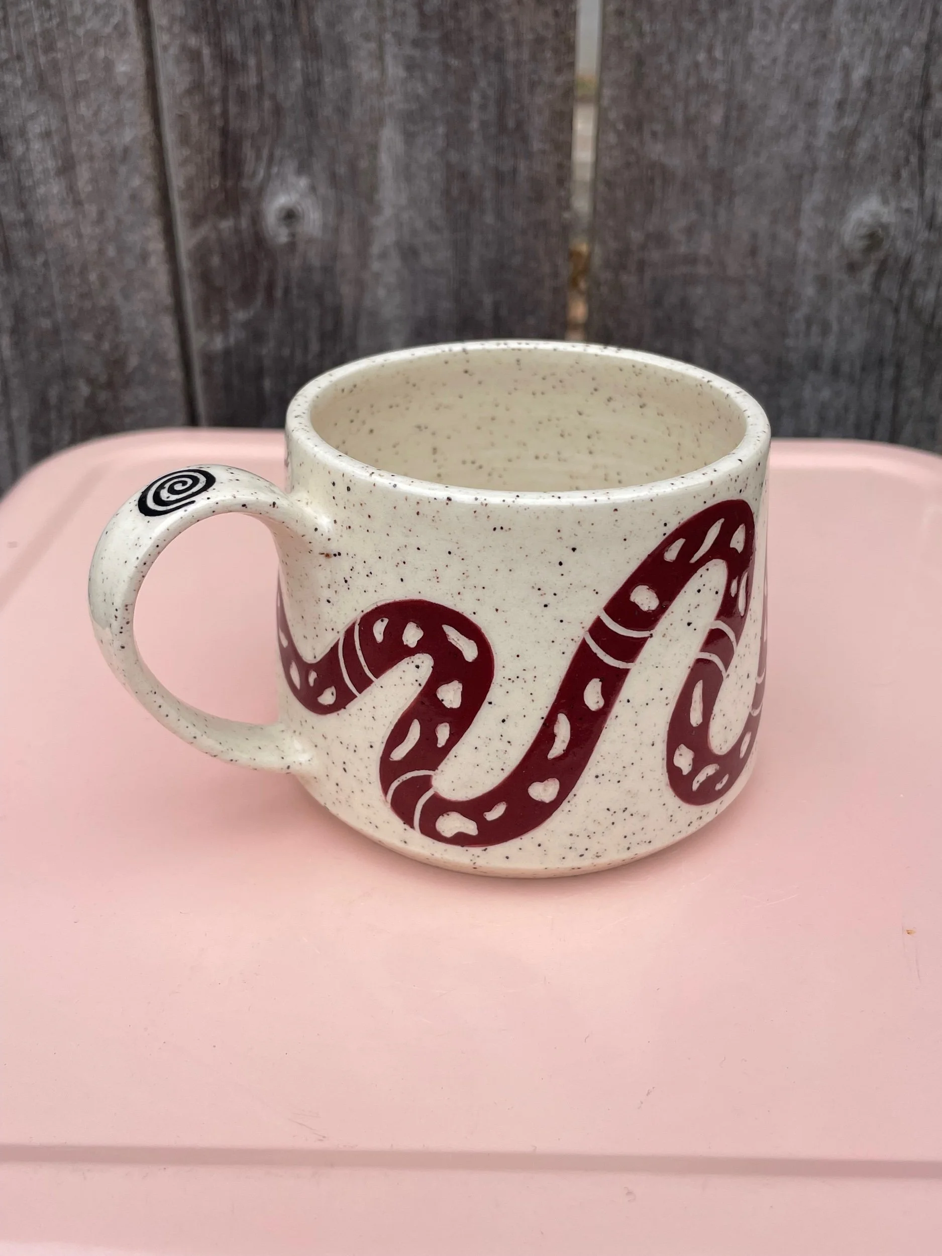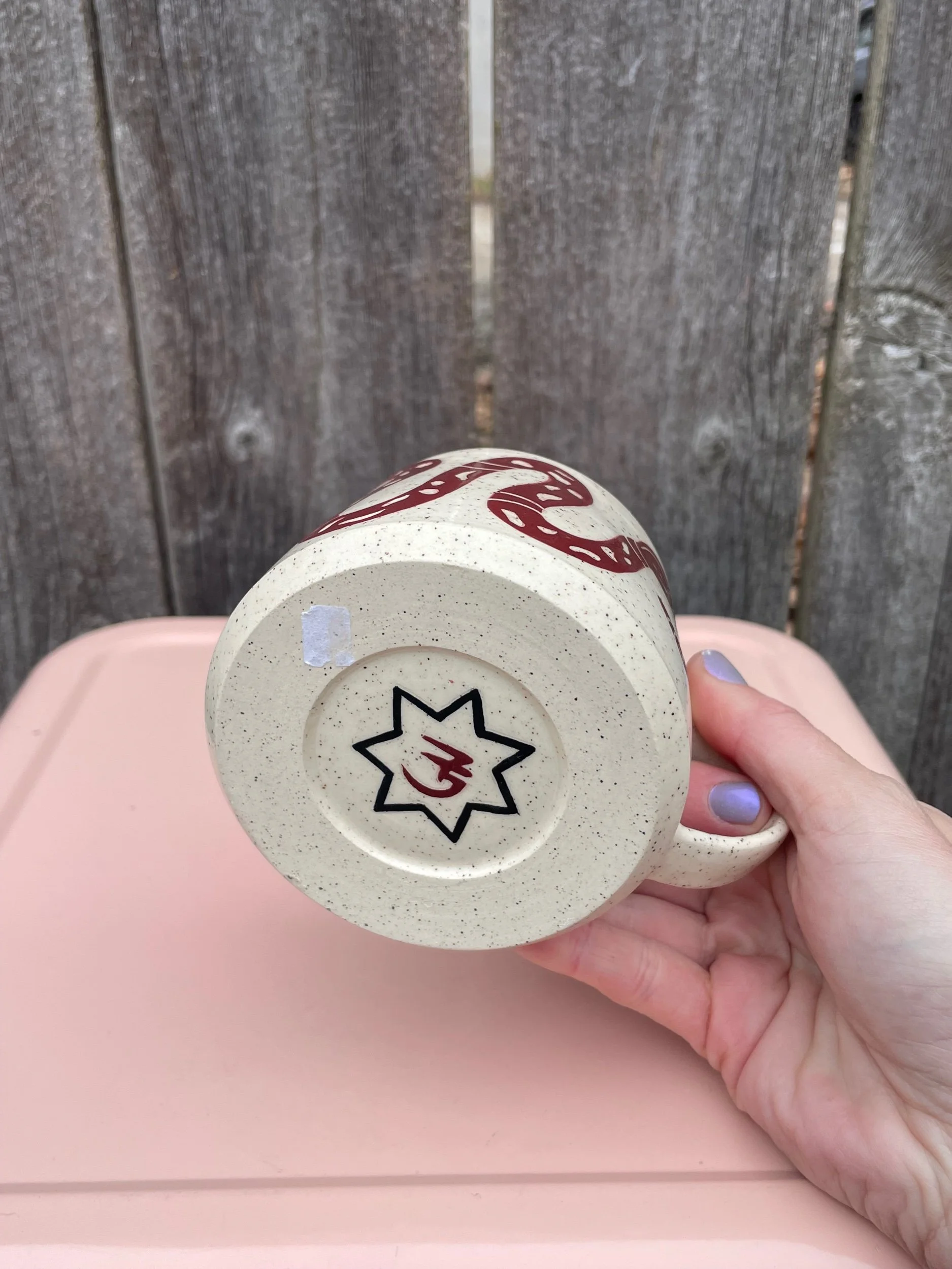 Hand made ceramic mug with a underglaze design and clear glaze on top. Liquid, microwave and dishwasher safe, but hand washing is always safest. 2.7 in tall and 3.2 in opening.